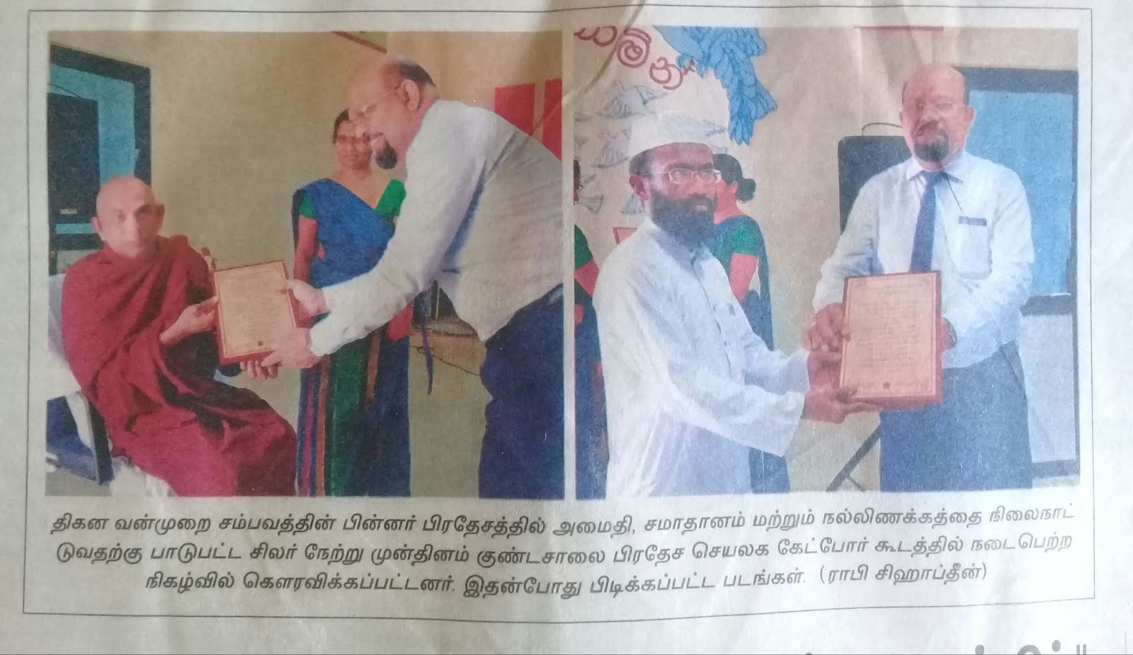 Mahanama Thero, Mou Fazal, and 65 people were able to maintain peace, and reconciliation in the area after the Digana violence incident.